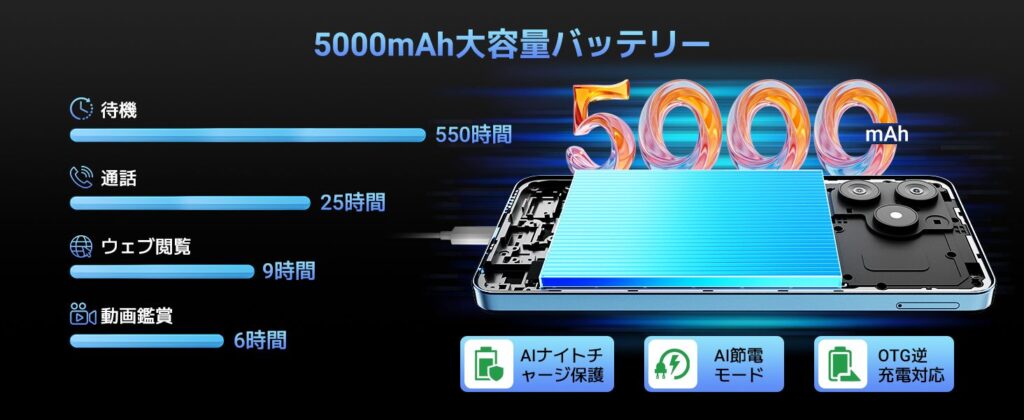 5000mAhというバッテリー容量は、この価格帯のスマートフォンとしては非常に大容量であり、Blackview Wave9Cの大きな長所の一つです。
