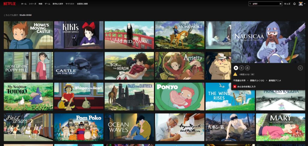 Netflixは国ごとに配信コンテンツが異なり、日本以外のいくつかの国ではジブリ作品が配信されています。
