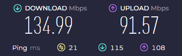正直、結果を見て驚きました。 ダウンロード速度(下り)はVPNを通しても 130Mbps越え をキープしており、4K動画の視聴も全く問題ないレベルです。VPN特有の「重さ」は一切感じません。