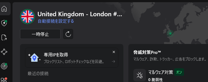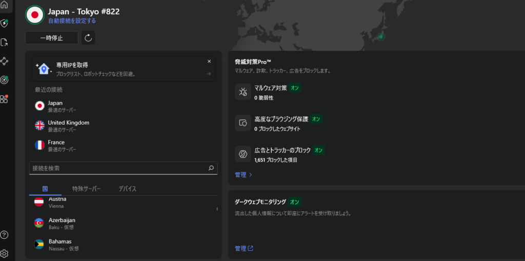 これだけで、その国の中で最も通信状態が良いサーバーへ自動的に接続してくれます。