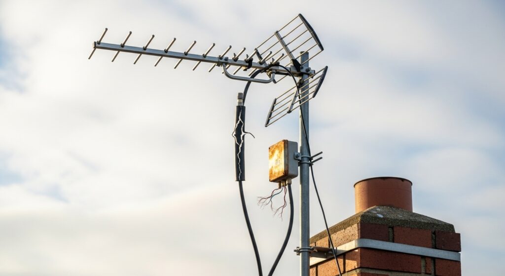 台風や強風などの悪天候の後は、屋根の上などに設置されているアンテナの向きがズレてしまうことがあります。